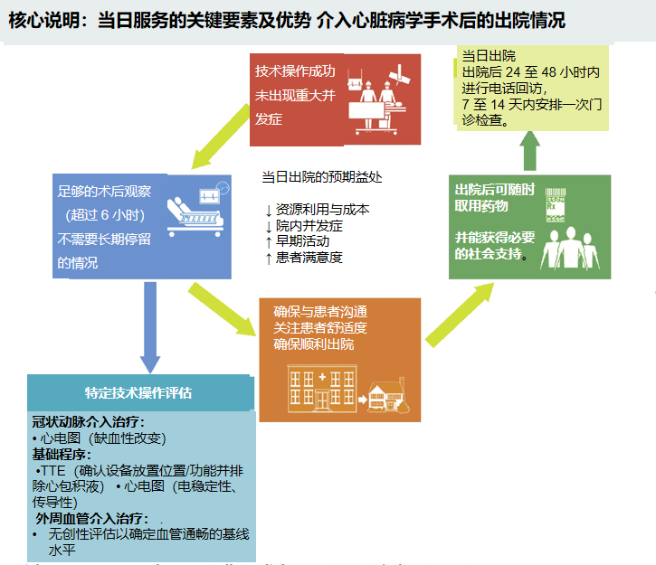 - 四大关键要素的系统性整合:成功的经皮心血管介入术后当天出院路径包含患者与手术选择、术后密切观察、针对每种手术类型的术前评估以及出院后的患者支持系统四大核心要素。