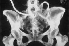 卵巢癌患者,结肠梗阻,经皮肠造瘘减压后,经造瘘口植入结肠支撑架,1个月后随访支撑架未开放 支架的两端不应该被结肠袋所覆盖。如果有这种情况发生,那么在支架未完全释放时立即调整支架的位置。有些学者建议低渣饮食以及服用矿物油,以此预防因为粪质变硬而引起支架闭塞。操作完成后,应该监测患者的生命体征和电解质,直至这些数值达到正常范围。支架安放后24小时,应行腹平片检查,再一次来评估支架的位置,检查支架有无移位或有无穿孔,以及在影像学上对比操作前后梗阻的变化。也有作者报告急诊支撑架植入后使用CT虚拟结肠镜(CT Colonography)[1]在患者的支撑架植入后的恢复期,同时对肿瘤进行分期,从而决定再行手术切除的风险和价值。常规腹部CT或超声来进行肿瘤分期,理想的方法是通过PET-CT或全身弥散加权成像技术。如果患者恢复良好,术前评估基本可以在门诊进行。 不能手术切除或广泛转移的患者,支架安植入术作为姑息治疗的手段。患者应规律随访。若出现梗阻的症状或腹膜的症状,应行影像学检查。在给患者做查体(如直肠指诊)的时候,以及给需要再次手术治疗的患者做手术的时候,需要高度重视金属支架在场内的存在,以免伤到检查或实施手术的医生。 结肠支架的植入可以在内镜引导下,透视引导下,或在联合使用两者的情况下完成。两种方法都各有优缺点。在近端结肠释放支架时,联合使用两种方法获益最大。透视下引导操作适用于降结肠远端,乙状结肠和直肠的病变。如果操作技能熟练的话,两种方法的有效率和成功率是相似的。在进行透视及内镜引导操作时,患者及操作者所接受的放射性暴露是一个非常重要的问题。有人曾在12例病人手术过程中测量过手术及透视操作的时间及总的放射剂量(dGy/cm2)。平均手术时间为57.3分钟,透视时间为20.9分钟,平均总剂量为3595 dGy/cm2。有报道称用内窥镜辅助的联合方式经肛金属支架放置术可以缩短透视的操作时间。Binker等人认为,内镜辅助下的操作可降低放射剂量,但是提高了成本,并且在所有的患者在术中需要加大镇静的剂量。 | ||||||||||||||||||||||||||||||||||||||||||||||||||||||||||||||||||||||||||||||