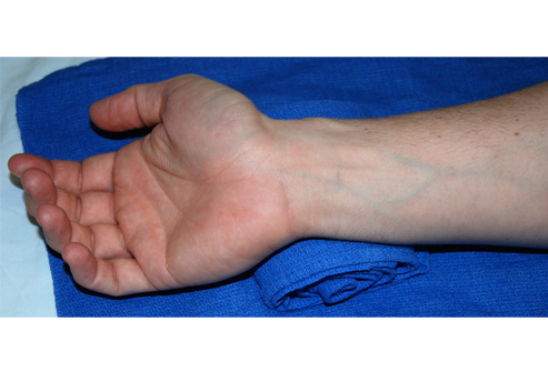 ![]() 解除尺动脉压力,继续压住桡动脉,手掌颜色在数秒中内恢复。如果5秒中内恢复,Allen实验为阴性(正常),桡动脉穿刺是安全的。如果5秒钟内颜色没有恢复正常,Allen 实验为阳性(异常),在这种情况下到手掌的侧支循环不充分,应该取消桡动脉穿刺,该行其它部位的穿刺。Allen实验的价值存有争论,阴性可能不保证到手掌的侧支循环充分。相比之下,阳性也不见得侧支循环不充分。所以桡动脉穿刺之前对高危病人采用血管超声观察侧支循环可能为最佳选择,或脉搏氧饱和度仪(Pulse Oximeter)测定血氧饱和度或波形。 ![]() 病人仰卧位,上肢保持自然位置,保持手掌向上,充分暴露腕部。用卷起的消毒单或纱布卷保持腕部过伸30°,以减少血管扭曲,易于穿刺。 ![]() 4%的洗必泰( chlorhexidine )或聚维酮碘消毒腕部皮肤,消毒范围包括如图所示。在预计穿刺的部位用25或27号穿刺针,注射1~2%利多卡因1~2ml进行局部麻醉。
