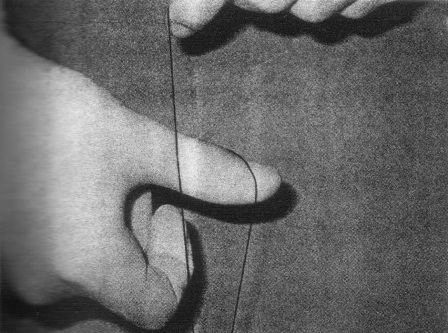 ![]() 然后用食指将同侧一端勾住向上穿过两线之间,完成方结(图10)。