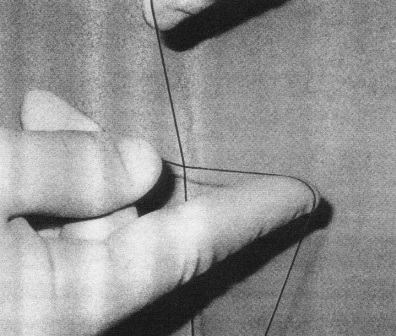 ![]() ![]() 然后将线推紧。用同侧手的食指向下置于两线之间(图9)。