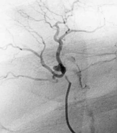 栓塞导管的选择 在诊断性血管造影后,血管造影导管可以直接前进到靶血管位置进行栓塞。亲水导管和导丝可以使导管头前进的末梢的血管。使用标准的血管造影导管进行栓塞常见于肾动脉,肝动脉,脾动脉和髂内动脉的栓塞。使用的栓子包括明胶海绵块,明胶海绵颗粒,明胶海绵粉,弹簧栓,酒精等。一般常见的微导管有4种,Tracker-18, Tracker-325, MicroFerret-18,SP导管。它们一般可以通过5F导管与之形成共轴导管系统。同时本身也能接受0.018英寸的导丝,以利于微导管的推送力和旋转的控制力。这些导管各有特点。可以允许直径300-800微米的颗粒通过。由于较细可以前进到更为末梢的血管,使栓塞更为有效和安全。 特殊导管包括球囊阻塞导管,可以在注射栓塞剂时防止栓子逆流和控制血流速度以利于动静脉畸形的栓塞。可脱球囊导管,可以进行海绵窦瘘的栓塞。