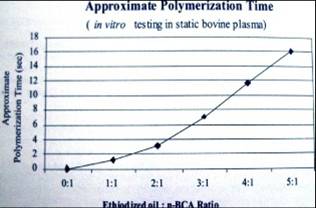cyanoacrylate 作为单体是透视下不可见的液体。在离子环境下,单体之间共价键形成实性聚合体。添加乙碘油干扰NBCA和血液的接触,从而可以减缓聚合时间并增加透视下可见性。 钽粉也可以使n-BCA聚合的启动作用减慢,而乙噻嗪则减少聚合的时间。常用的混合物为1:1到1:4的胶合剂/乙碘油。应该在可视性和聚合时间之间进行综合考虑。胶合剂的稀释度和聚合之间表现为一种线性关系(1秒对应1:1,而4秒对应1:4的稀释度)。因为单体在与离子环境接触时会发生聚合,所以只有D5W(5%的葡萄糖液体)可以用于冲管。此外,应该使用聚丙烯注射器,因为聚碳酸酯的注射器可能被氰丙烯酸酯破坏。在使用n-BCA 之前建议进行训练以有效完成栓塞和防止并发症。对这种技术及其细节的完整描述超过了本网页的范围。已经描述了许多非适应症(off-label)的用法,包括胸导管栓塞、外周动静脉畸形栓塞以及主动脉内支架植入后的内瘘栓塞。 ![]() 商品化的NBCA、碘油和钽粉