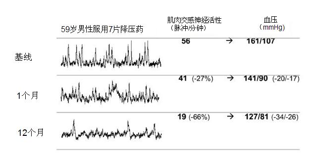 在正常情况下,肾脏通过水钠的重吸收,肾素释放的调节以及交感神经的相互作用维持血压在正常范围内。而这种平衡一旦破坏,负责肾脏交感神经传入和传出神经纤维相互被激活促进高血压的发生和发展。 似乎最为关键的是证实去肾交感神经支配术的确减少肾交感神经的活性。为了这一目的,10例病人应用放射性示踪剂稀释方法评估其肾的去甲肾上腺素动力学作为测量肾交感神经活性的指标。的确,双肾去肾交感神经支配术后,来自肾的去甲肾上腺素溢出减少47%(95% CI 28-56%),从而证实去肾交感神经支配术在完成输出肾交感神经消融术后的有效性。另外,这一治疗的直接结果是其中一个病人肾素分泌减少大约50%[25],这可能和血压下降的结果有关,或许部分由于通过中枢交感输出反应的介入减少循环中血管紧张素II水平。但是一个病人的单独的肾素反应不能反映顽固性高血压人群,进一步研究将充分地证实这一有吸引力的假设。 通过微神经照相术(microneurography)这一切应与基线到12个月之间中枢交感神经输出进行性减少的发现相对应[25],也可能带来与肾交感神经消融相关的传入神经的变化。 通过输入和输出神经信号的变化能够解释的另一个概念包括去肾交感神经支配术术后心脏压力反射敏感性(cardiac baroreflex sensitivity)改善(从7.8→11.7ms/mmHg)和心脏MRI左室质量(指数)从基线到12月时,下降7%(从78.8 → 73.1g/m2) 肾到中枢交感驱动减少:顽固性高血压病人肌肉交感神经活性[25]