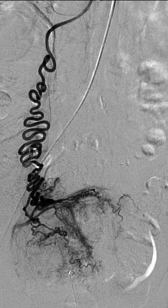 子宫动脉栓塞后子宫肌瘤部分或全部从子宫壁脱离可以引起疼痛(绞痛),严重的阴道出血,阴道分泌物(脓性或恶臭)和感染,或全部或部分子宫肌瘤经阴道排出。MRI可以评估子宫的完整性(子宫梗死等),子宫肌瘤的位置或还有残活的子宫肌瘤。从子宫壁脱离的子宫肌瘤向宫颈运动。