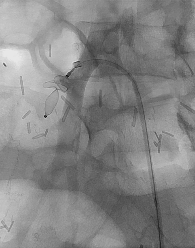 经静脉团穿刺引入5F导管至引流静脉并释放AVP IV 血管塞 |
