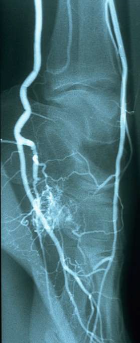 动静脉畸形在不同的部位可能的生理病理影响是不一样的。在肢体部位由于大量的动脉血经瘘口回流导致肢体远端缺血和静脉高压。栓塞瘘口可以改善远端动脉血流的灌注,改善缺血状态。 33岁,男;足趾溃疡。发现足动静脉畸形。