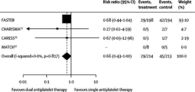 研究(纳入标准为发病后3个月内,非早期干预研究)[9]的荟萃分析发现6例卒中复发均发生在单用阿司匹林组,而联合用药组无1例发生卒中复发(P =0.03)[3]。为TIA/小卒中患者联合使用阿司匹林和氯吡格雷增添了新证据。