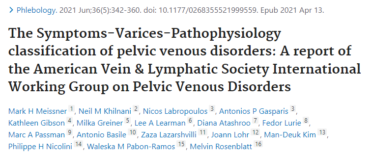 随着盆腔静脉疾病(PeVD)重要性的日益认识,该领域的进展因缺乏有效可靠的分类工具而受到限制。误导性的历史命名(如May-Thurner综合征、盆腔充血和胡桃夹综合征)往往未能认识到许多盆腔症状及其潜在的病理生理学之间的相互关系。基于感知到的需求,美国静脉与淋巴学会(American Vein and Lymphatic Society)召集了一个国际多学科小组,负责开发PeVD的鉴别分类工具。PeVD的症状-静脉曲张-病理生理学(“SVP”)分类包括三个领域——症状(S)、静脉曲张(V)和病理生理学(P),病理生理学领域包括患者疾病的解剖学(A)、血流动力学(H)和病因学(E)特征。每个患者的分类被指定为SVPA,H,E。对于有盆腔起源下肢体征或症状的患者,SVP仪器是临床-病因-解剖-生理学(CEAP)分类的补充,并应与之一起使用。SVP工具准确定义了PeVD患者的多样化人群,是改进临床决策、开发疾病特异性结局指标和为临床试验确定同质患者人群的重要一步。 盆腔静脉疾病与两者引起的一系列症状有关 - 反流最常累及卵巢静脉和髂内静脉 - 还有梗阻,通常是左肾静脉和髂总静脉 盆腔静脉(性腺静脉、髂内静脉及其支流、骨盆静脉丛)及其主要引流途径(左肾静脉、髂静脉和骨盆引流点)引起的症状和体征谱 ![]() 为什么要采用新的定义 使用老的综合症命名法阻碍了进展 - May-Thurner综合症 - 盆腔充血综合征 - 胡桃夹综合症 它经常混淆潜在的病理生理学,导致诊断错误和次优治疗结果 此外,缺乏一个强大的分类系统来定义同质的患者群体 - 限制临床交流 - 使得解读文献变得困难 - 阻碍了适当临床试验的开展 定义 DEFINITION(老定义)