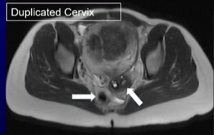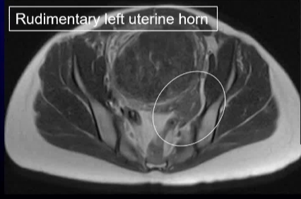 47 岁的 G1P1 女性因持续两年的月经过多症状前来就诊。 症状还包括盆腔痉挛性疼痛、尿频和背痛。妇科病史显示存在一种已知的苗勒管异常(MDA)。按照方案要求进行了盆腔磁共振成像(MR)检查,以评估子宫肌瘤栓塞术(UFE)的情况。检查结果显示为单角子宫,其主导的右侧子宫角存在强化的全层和黏膜下肌瘤,左侧则有一个相通的原始子宫角。 MR 还显示右侧有一个孤立的肾脏,右侧子宫动脉占主导地位,而左侧的子宫动脉和卵巢动脉均无法辨认。 子宫肌瘤被认为是导致月经过多和下腹肿块症状的原因。