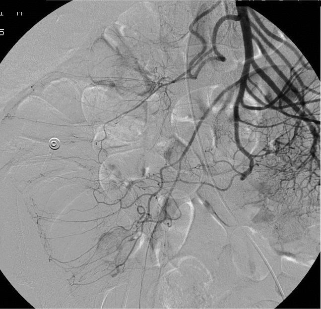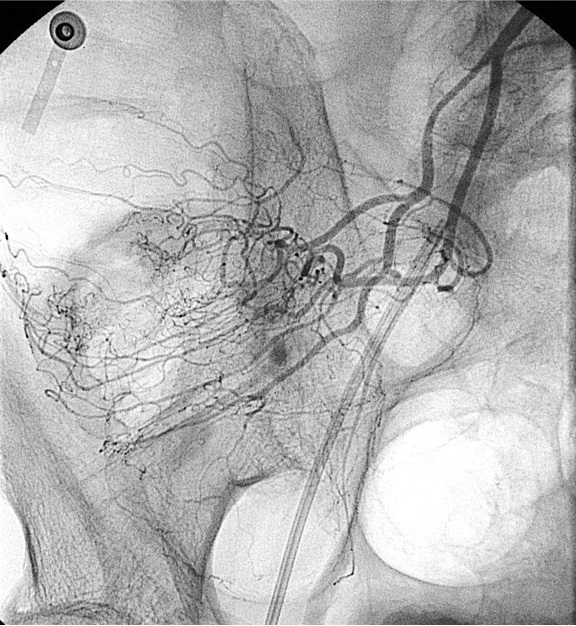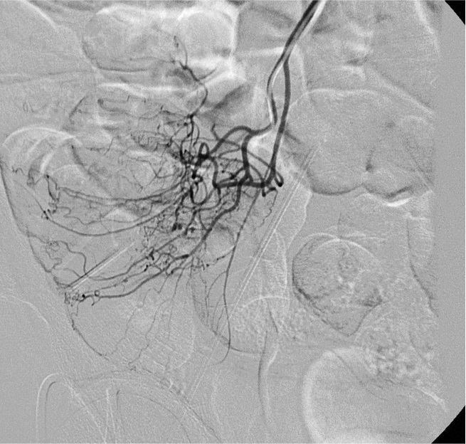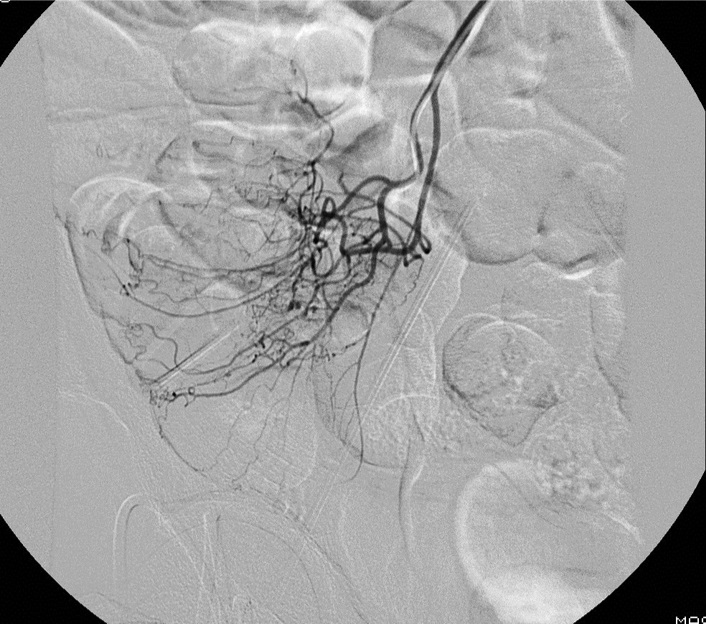 64岁 男性 无相关病史。因下消化道出血急诊室就诊。考虑到急诊出血情况下效果差,未进行结肠镜检查。CTA 未显示造影剂外溢,但右结肠/回肠大憩室。临床持续出血和生命体征恶化,介入医生会诊决定进行动脉造影。