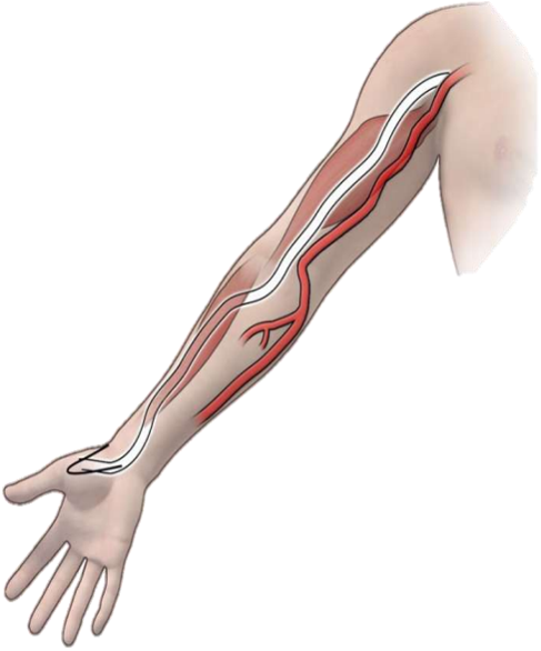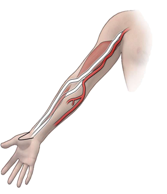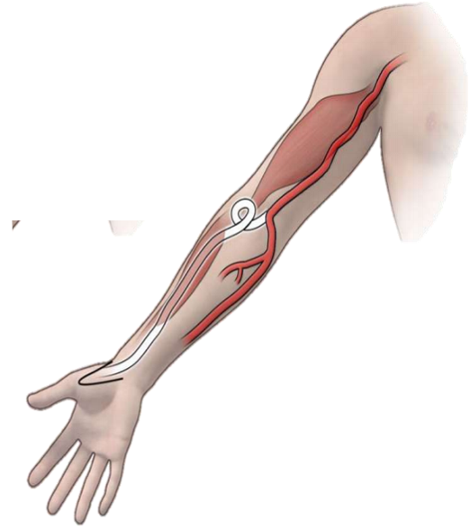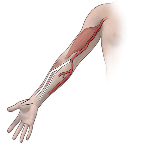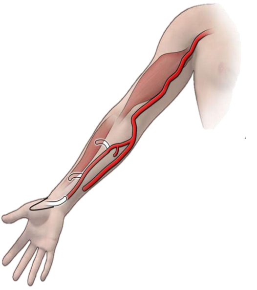 桡动脉位于肱桡腱和桡侧腕屈肌腱之间,从腕部到远端桡骨头有2cm可以触及搏动。初始穿刺部位尽可能在远端,但至少在茎突近端1cm,以避免穿刺屈肌支持带( retinaculum flexorum )和桡动脉小的表浅分支。但任何病人必须有手的双重动脉供血才是经桡动脉路径的适应症。