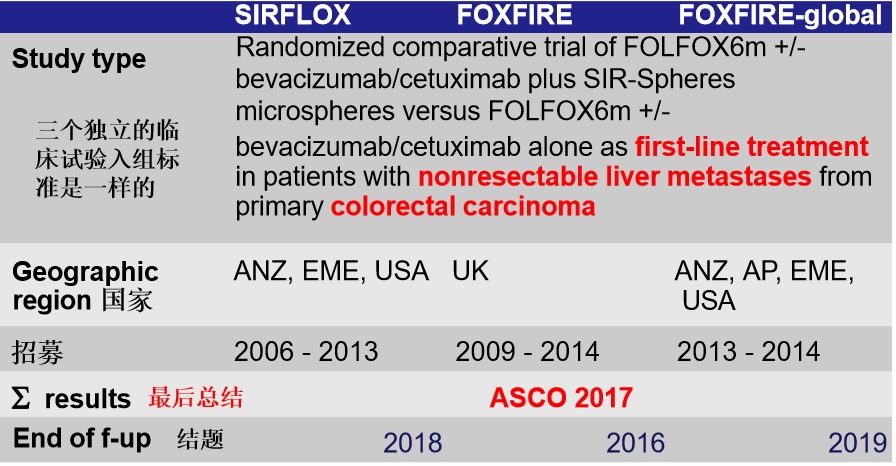 研究的特征Trial Characteristics 这 3 项研究的目的是为了评估化疗联合 SIRT 比较单纯化疗治疗结直肠癌肝转移的疗效。入组历时 8 年(2006 ~ 2014 年),由不同地区的 14 个国家参加。3 个研究的入组条件相同,包括 :结肠或直肠 腺癌患者,肝脏转移灶不能