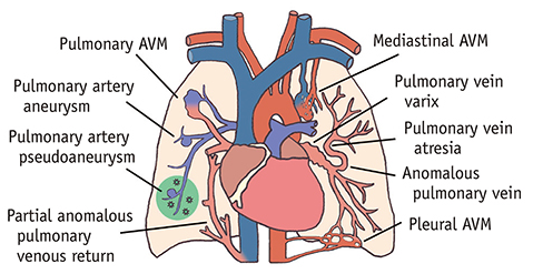 CTA 鉴别诊断肺动静脉畸形(Pulmonary arteriovenous malformation, AVM)是由供血动脉、病灶和引流静脉组成的血管集合体。血管巢(Nidus)是指肺动脉和肺静脉之间没有毛细血管网的直接连接。准确的诊断和恰当的治疗是至关重要的,因为脑动静脉畸形可导致严重的发病率和死亡率,如脑脓肿、脑卒中和肺出血或血胸。目前,肺动静脉畸形多在体检时偶然发现,影像学诊断通常基于胸部增强CT。 然而,一组罕见的血管病变在CT图像上常被误诊为肺AVM,最终可能导致常规的肺动脉造影进行栓塞 【Hanson JM, 2005 Tokunaga K, 2017 Gill SS, 2015 Hyun D, 2014】[1,2,3,4]。 ![]() 在文献中,在CT影像上诊断的肺动静脉畸形中,约有10%在常规血管造影中被证实没有肺动脉和静脉之间的瘘口。其中2 / 5为肺动静脉畸形以外的肺血管异常,其余3 / 5为肺实质结节【Lin CT, 2018】[5]。 肺动脉-肺动脉侧枝循环 肺静脉曲张 获得性肺静脉曲张 支气管囊肿 血管性肿瘤 肺静脉畸形非常罕见,介入放射科医师都不熟悉。异常静脉回流体循环静脉需要矫正手术由于右向左分流。左心房静脉回流正常者可随访,无需治疗。在大多数情况下,通过对比剂增强胸部计算机断层扫描(CT)和x线摄影可以确诊。但肺动脉造影对各种肺静脉畸形的鉴别诊断具有决定性作用。DHyun D 2014 报道1例胸部增强CT初步诊断为肺动静脉畸形(AVM)后,经肺动脉造影证实为单侧单肺静脉畸形(AUSPV)的病例。Hanson JM 2005 报告另外两例并进行了相关文献的复习。 Tokunaga K 2013 探讨CT影像中的中的“松针征”能否用于区分肺动静脉畸形及其相似病变 |
