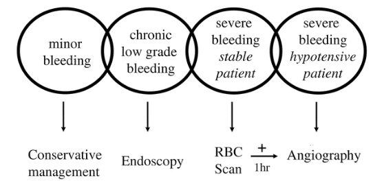 推荐的分流策略: · 严重活动性出血 → 直接血管造影 + 栓塞 · · 间歇性/慢性出血 → 肠道准备后行内镜 · · 所有血管造影患者均应后续行结肠镜检查(明确病因、排除缺血、发现多发病变) 7. 与其他栏目内容的整合你之前整理的“严重出血稳定→CT;严重出血不稳定→血管造影”是现代更常见的流程。本文发表于2004年,当时CT血管成像尚未普及,因此其流程中“稳定但严重出血”用的是核素显像+靶向血管造影。 若将两者结合,现代流程可整合为: