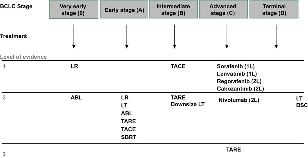 在的美国肝病研究学会(AASLD)指南中也采用了类似的方法【Marrero JA, 2018 Foerster F, 2019】,(2,40)根据证据级别对每个巴塞罗那临床肝癌(BCLC)分期提出了不同的治疗方案(下图)。例如,BCLC A 期患者被认为适合进行肝切除术(LR)、肝移植(LT)、射频消融(ABL)、化疗栓塞、放射性栓塞和立体定向体部放疗,而 BCLC B 期患者则被认为适合进行化疗栓塞、放射性栓塞和肝移植(在降期后)。