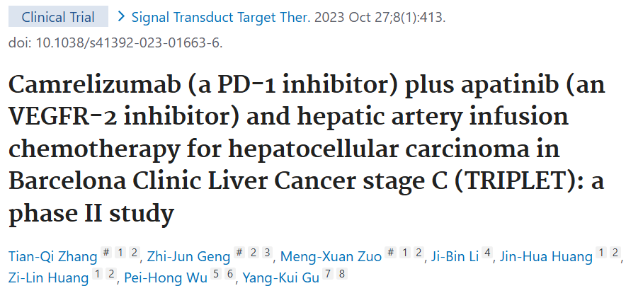 近期一期《信号转导与靶向治疗》(Signal Transduct Target Ther)杂志刊登了张博士及其同事开展的一项发人深省的研究,该研究是一项关于卡瑞利珠单抗 [一种程序性细胞死亡蛋白1(PD - 1)抑制剂]联合阿帕替尼[一种血管内皮生长因子受体2(VEGFR - 2)抑制剂]及肝动脉灌注化疗治疗巴塞罗那临床肝癌分期C期(BCLC - C)肝细胞癌(HCC)的Ⅱ期试验【Zhang TQ 2023】。这项试验为现有的BCLC - C期HCC患者治疗知识体系做出了贡献。
