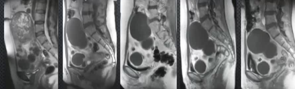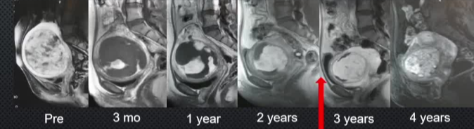 无症状复发![]() 分别是基线→3月→1年→2年→3年 【Pelage JP 2004】 子宫肌瘤有治疗有需求,子宫动脉栓塞术(UAE)具有应用价值。本研究通过3年MR随访,旨在评估UAE治疗子宫肌瘤后的长期磁共振(MR)成像结局,探讨UAE治疗后肌瘤梗死程度与长期预后的关联,为临床疗效评估提供影像学依据。 方法概述采用增强MR成像,动态监测肌瘤体积、灌注及症状变化,通过组间比较(t检验、卡方检验)分析梗死程度对结局的影响。研究对象为20例患者,在UAE术前、术后3个月及每年随访(最长3年)进行对比增强盆腔MR成像,分析肌瘤梗死程度、体积变化、症状改善及新发肌瘤情况。其中17例患者在基线、治疗后3个月和3年进行了对比增强MR成像。 核心结果