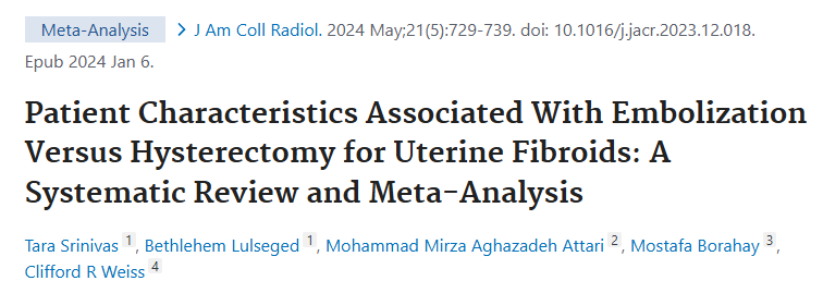 本文是一篇关于子宫肌瘤(UFs)患者在接受子宫动脉栓塞术(UAE)与全子宫切除术(hysterectomy)之间相关人口特征的系统评价和荟萃分析的文章。