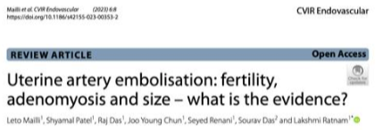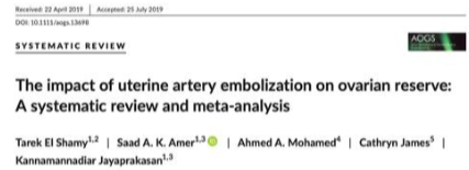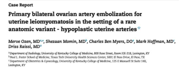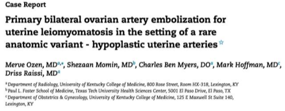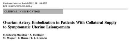 ![]() 双侧子宫动脉发育不良 双侧卵巢动脉栓塞术 - 500 - 900 微米 未出现卵巢功能衰竭 ![]() 约10%-15%的患者在接受UAE后未见明显改善,其中一些病例可能是因为卵巢动脉提供了额外的血供。 文章通过回顾六例患者的治疗经验,探讨了卵巢动脉栓塞术(OAE)作为子宫动脉栓塞术(UAE)补充疗法的可行性和效果。研究发现,OAE能够成功地使肌瘤缺血坏死,并且大多数患者在术后症状有所改善。尽管存在技术挑战,但OAE似乎是安全有效的。此外,所有接受OAE治疗的患者均保留了正常的月经周期,这表明该手术可能不会导致卵巢功能丧失。然而,由于样本量较小,目前的研究结果尚不足以得出明确结论,需要进一步的研究来验证这些发现。 ![]() 评估在有卵巢动脉参与供血的症状性子宫肌瘤患者中,进行卵巢动脉栓塞术的安全性及临床结局。 共13名患者,均有症状性子宫肌瘤,且MRI或血管造影显示有卵巢动脉参与供血。并在初次或二次进行补充卵巢动脉栓塞术。