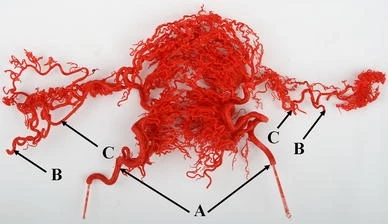 卵巢动脉与子宫动脉的吻合 CTA?MRA? 铸造技术-微小的动脉血管网络以及微小的卵巢-子宫吻合口 【Quyang Z 2012 南方医院妇产科】 吻合口总是存在!anastomoses always there ![]() 血管铸型标本。A 子宫动脉,B 卵巢动脉,C 卵巢动脉-子宫动脉吻合口 卵巢动脉与子宫动脉的吻合 血液动力学对解剖结构的影响