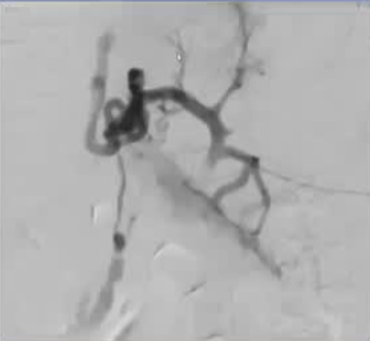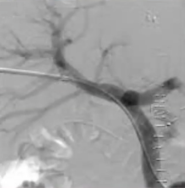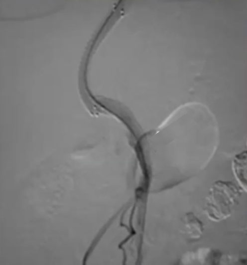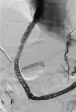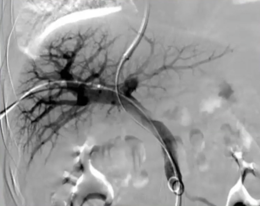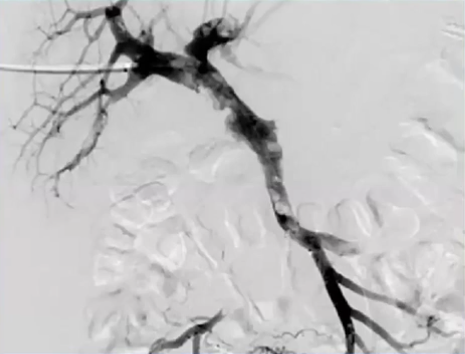 急性病例,已有肠道缺血的迹象,经皮穿刺入路,尿激酶溶栓(t-PA),血流不畅,转为经颈静脉肝内门体分流术(TIPS),抗凝治疗