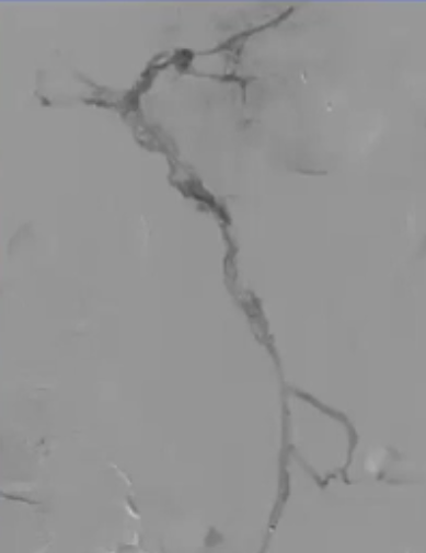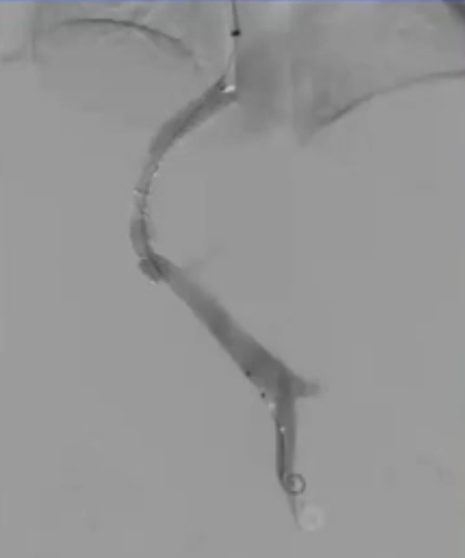 急性门静脉血栓(续) 对于那些成功实施经颈静脉经肝到达门静脉内急性血栓内,并进行了溶栓和抗凝治疗的患者,是否应该进行经颈静脉肝内门体分流术(TIPS)呢(放支架)? 这一问题存在争议。 。一个过于激进的TIPS手术,导致门静脉分支没有血流,从而发展成肝硬化 妥协的操作是设置一个“小TIPS”,即放置一个直径较细(直径5毫米左右)的TIPS裸支架,溶栓导管经支架通过,进行抗凝和溶栓治疗后,同时保留 TJ 对 SMV/PV 的访问权限,以防再次发生血栓情况。 一例术后急性门静脉血栓病例,最终影像显示门静脉根部血流情况良好,这还不够理想,担心会再次发生血栓,且门静脉压(PSG)超过 12 毫米汞柱,因此增加了经导管动脉溶栓术(TIPS)的治疗方案。