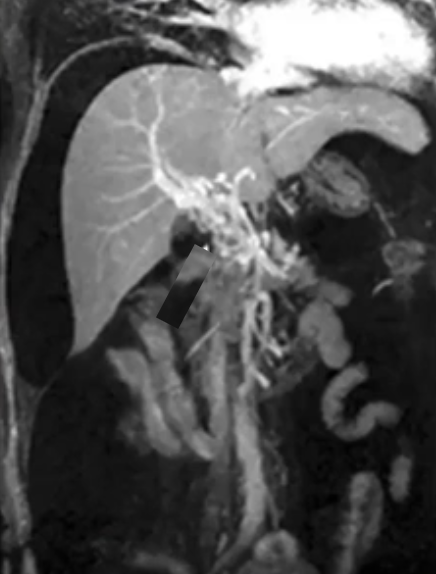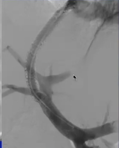 这些患者通常就诊较晚,且诊断有误,其肝脏发展为肝硬化的可能性很大。 经颈静脉肝内门体分流术(TIPS)能够维持或促进门静脉系统和脾静脉系统的通畅。 采用初始的经皮穿刺途径有助于实现 TIPS 手术。(初始经皮经肝导管作为门静脉穿刺标记) 门静脉与体循环之间的压力差有助于做出这一决定,但在没有血流情况明确的情况下,其准确性存疑。