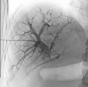 伴有腹痛及肠道缺血的情况 使用抗凝剂治疗后,大多数患者会有所好转,但有 10% - 20% 的患者治疗无效。 对于这些患者,应进行经皮经肝的血栓性门静脉(PV)穿刺、溶解、抗凝治疗,通常效果是足够的,越早发现病情越好。 经颈静脉的通路不建议作为首选方法,因为接受溶栓治疗的患者其并发症风险较高。 使用 t-PA 治疗后,肝内血流情况良好,且可见外周门静脉分支血管,继续使用 t-PA,并进行抗凝治疗。