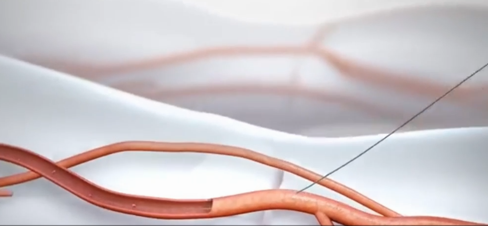 微创进入:经股静脉入路,将导管置入受累的深静脉(如股静脉、腘静脉)。