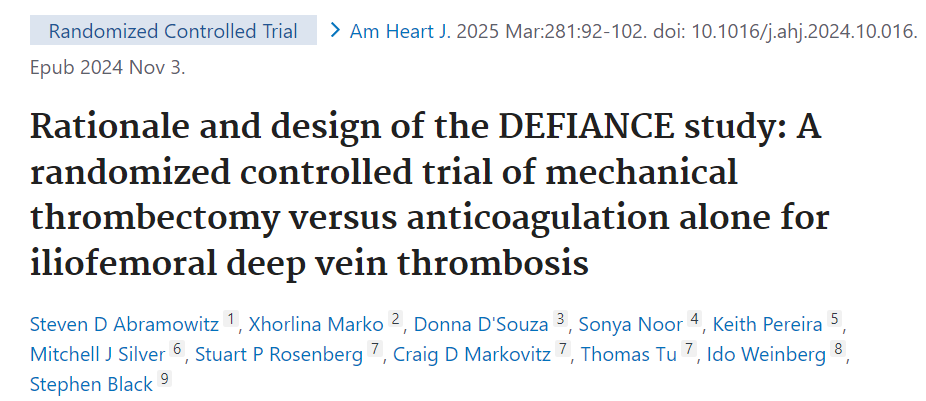 研究设计:DEFIANCE研究是一项国际多中心、随机对照试验,评估机械血栓切除术与单独抗凝治疗的效果。
