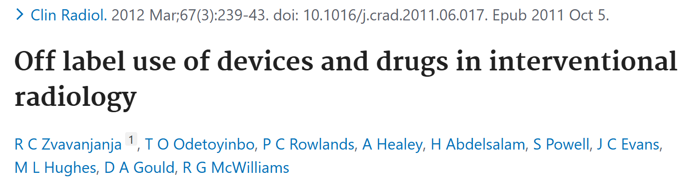 这篇发表在2012年的文章 探讨了在英国一家三级转诊医院的介入放射学(Interventional Radiology, IR)中,设备和药物的非标签使用(off-label use)的频率,并分析了这种做法对介入放射科医生的更广泛影响。研究通过收集一周内的介入手术数据,评估了所用药物和设备是否符合其批准的用途。