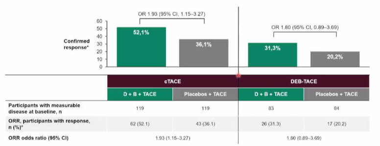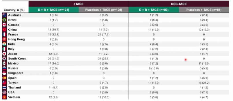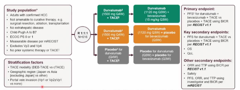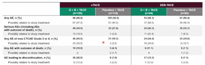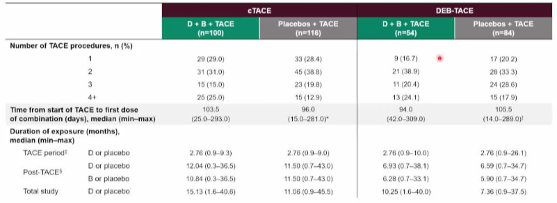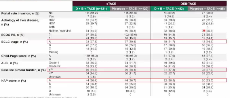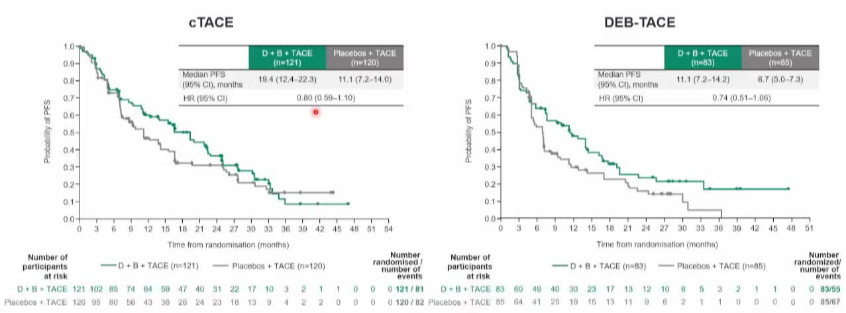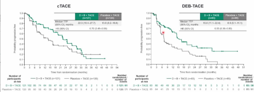 EMERALD-1 中TACE的治疗方式评估 20 多年来,经导管动脉化疗栓塞术(TACE)一直是不可切除肝癌(uHCC)患者的标准治疗方法。 但是,接受 TACE 治疗的 uHCC 患者的无进展生存期(PFS)仍然不佳,大约为 7 个月。 基于系统性免疫疗法的联合治疗现已成为晚期肝细胞癌的标准治疗方法。 经导管动脉化疗栓塞术(TACE)可通过释放新抗原和缺血作用,为抗 PD-L1 和抗 VEGF 治疗激活肿瘤微环境,这为针对适合栓塞治疗的不可切除肝细胞癌患者的研究联合治疗方案提供了理论依据。 EMERALD-1(NCT03778957)是首个全球性的 3 期临床试验,在该试验中,度伐利尤单抗(抗 PD-L1 抗体)联合贝伐珠单抗(抗 VEGF 抗体)与经导管动脉化疗栓塞术(TACE)的联合疗法,在患有可进行栓塞治疗但无法切除的肝细胞癌(HCC)的患者中,相较于安慰剂联合 TACE,显示出具有统计学意义且具有临床意义的无进展生存期(PFS)改善(中位 PFS 分别为 15.0 个月和 8.2 个月;风险比为 0.77;95%置信区间为 0.61 - 0.98)9 在“EMERALD-1”研究中,TACE 治疗方式是一个预先设定的分层因素。研究参与者可根据研究者的决定接受常规 TACE 治疗或经导管栓塞 TACE 治疗。 因此,评估 TACE 治疗方式对 EMERALD-1 研究中疗效和安全性结果的影响至关重要。 EMERALD-1 研究设计:全球、双盲,安慰剂对照 III期研究 ![]() 在 cTACE 和 DEB-TACE 研究中,各治疗组之间的基线特征总体上较为均衡。 而在 DEB-TACE 组中,cTACE 组的参与者中 BCLC 分期较晚的患者比例更高。 A期 肿瘤 负担 ≤ 7.并且 HAP 评分 A ![]() 各国的 TACE 治疗方式在所采用的 TACE 治疗方式类型方面,观察到了地域差异。 ![]() 经动脉化疗栓塞疗法的无进展生存期(PFS)情况与安慰剂联合 TACE 治疗方案相比,使用 D + B + TACE 治疗方案可显著提高无进展生存期,这一效果无论在何种情况下均是如此。 通过 BICR 按照 RECIST v1.1 标准评估的 TACE 治疗方式 ![]() TACE模式下的肿瘤TTP通过 BICR 按照 RECIST v1.1 标准评估,使用 D + B + TACE 方案治疗的效果优于安慰剂 + TACE 方案,且无论 TACE 方式如何,这一效果均有所提升。 ![]() 根据 BICR 按照 RECIST v1.1 标准评估的客观缓解率与安慰剂联合 TACE 治疗相比,采用 D + B + TACE 治疗方案的 ORR(客观缓解率)显著提高,且无论 TACE 治疗方式如何均是如此。 ![]()