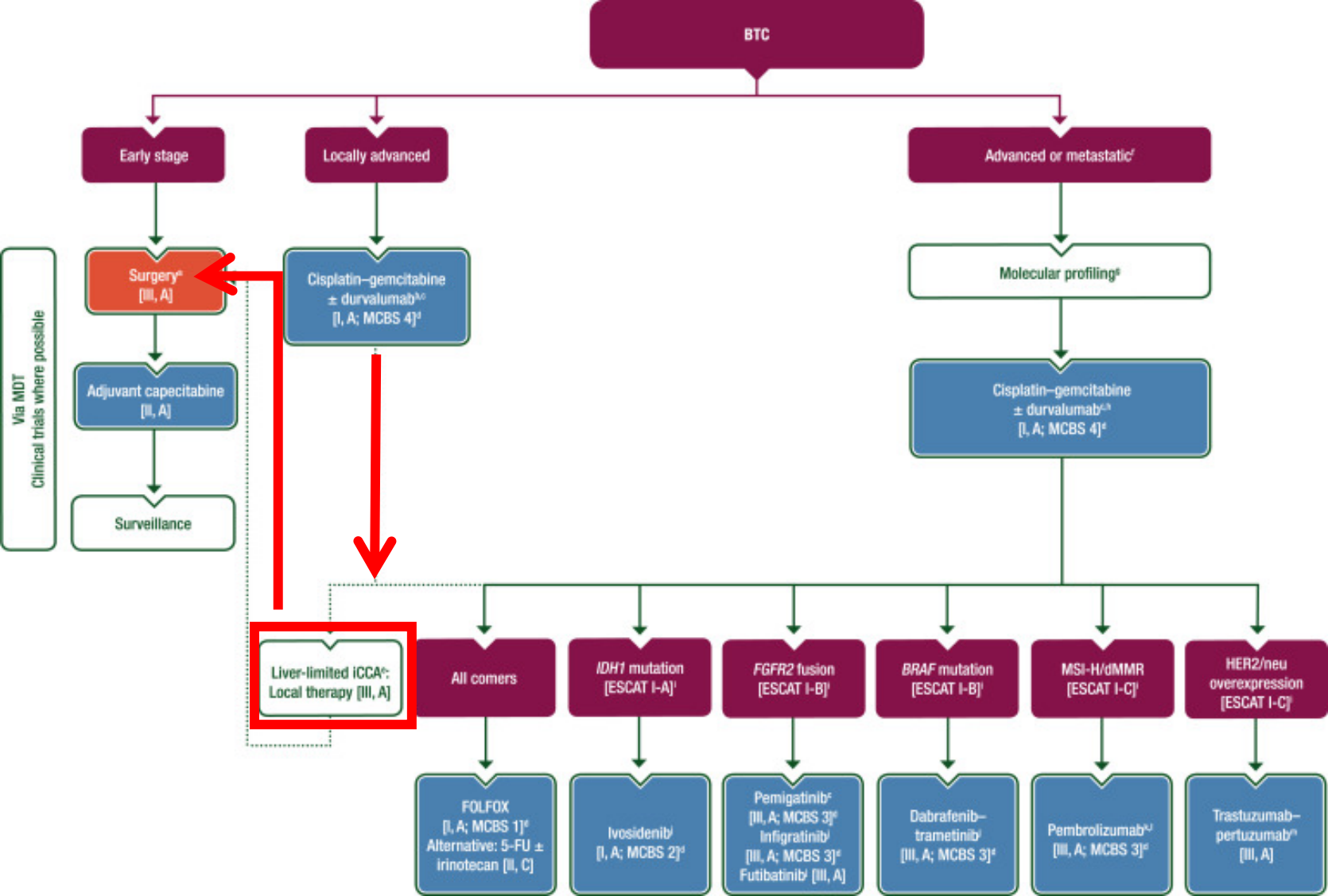 总结通过分析多个前瞻性临床试验的数据,比较了晚期、仅限于肝脏的 iCCA 患者在接受单独化疗与化疗联合 SIRT 治疗后的生存率和无进展生存期。结果显示,联合治疗组的总体生存率和无进展生存期均显著优于单独化疗组。尽管如此,作者强调仍需随机对照试验来确认这些发现。核心观点是,SIRT 联合化疗可能为这类患者提供更好的治疗效果,但需要更多高质量的研究来验证这一结论。 ![]() Biliary tract cancer: ESMO Clinical Practice Guideline for diagnosis, treatment and follow-up