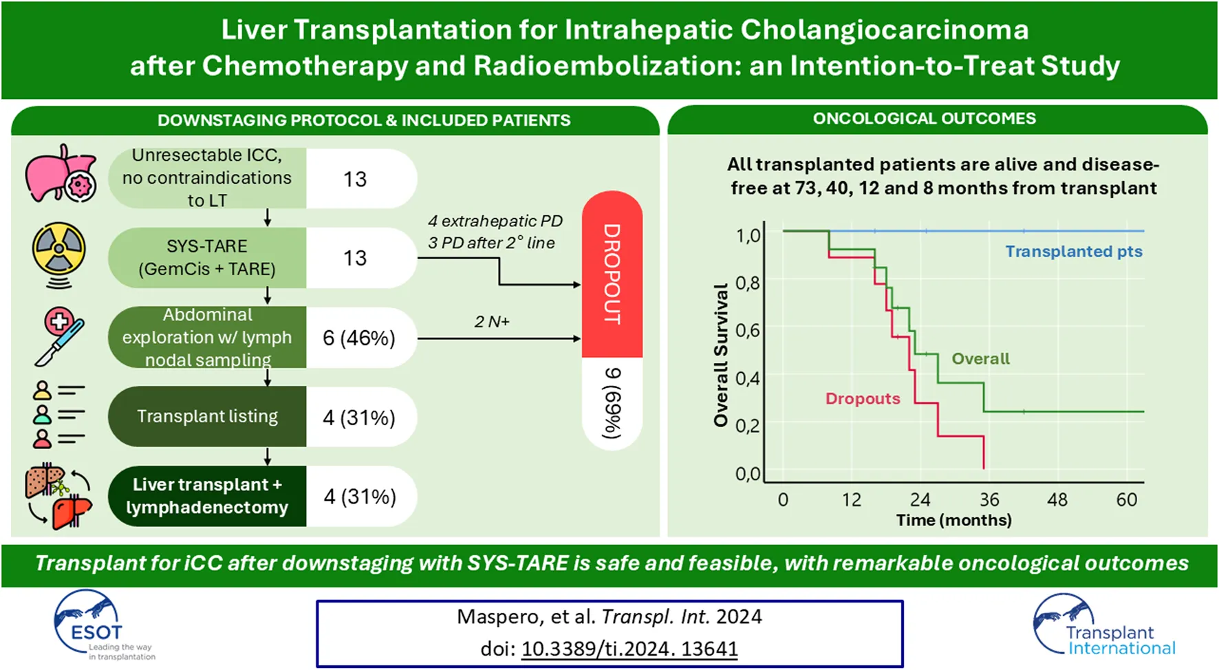 · 肝内胆管癌是一种侵袭性胆道恶性肿瘤,手术切除是唯一可能治愈的手段,但70%-80%的患者确诊时已无法切除。 研究目的 评估一项结合全身化疗(吉西他滨+顺铂)与放射性栓塞(TARE)的序贯降期方案,用于筛选适合肝移植的不可切除iCC患者,并报告前13例患者的意向性治疗结果。 研究方法
