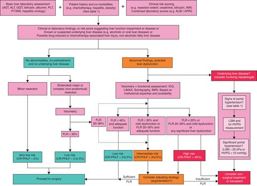 潜在或已知肝病:应在有潜在或已知肝病的患者中进行术前肝功能评估。 药物诱导性或化疗相关性肝损伤:应在怀疑或已知药物诱导性(DILI)或化疗相关性(CALI)肝损伤的患者中进行术前肝功能评估。 静态血液标志物 临床评估和血基评分:临床评估和反映肝功能或门脉高压的血基评分(如白蛋白/胆红素、血小板计数)有助于识别PHLF的风险。 未来肝脏残留体积:未来肝脏残留体积的体积测量是评估的基础,可以根据当地专业知识和可用性结合吲哚青绿清除率或LiMAx®。 替代方法:功能性磁共振成像和肝扫描是替代方法,可以将FLR体积和功能结合在一个检查中。 结论