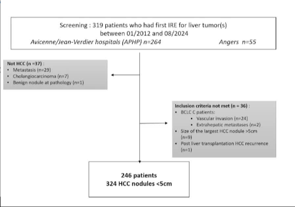 脉冲电场促使细胞膜产生缺陷 细胞内稳态的丧失导致细胞死亡(细胞凋亡++) 周围结构(血管、胆管、热敏感器官……)的保护措施 不存在“散热效应(heat sink effect)” 对于无法切除且不适合常规热消融治疗的肝脏肿瘤的治疗方案 对肝细胞癌(HCC)经 IRE 治疗后长期预后的回顾性评估 ![]() 来自两家三级医疗机构长达 12 年使用IRE的真实案例经验 IRE 治疗 HCC的局部疗效、安全性以及长期肿瘤学结果的评估 主要目标: 单独使用内镜下射频消融术后的局部肿瘤进展率 次要结局指标: 所纳入标准 肝细胞癌的诊断(依据欧洲肝脏学会标准或通过组织学确认) 最大肿瘤直径≤5 厘米 在首次的内镜射频消融手术中, 最多可治疗 3 个肿瘤。 BCLC 0 期、A 期或 B 期 排除标准 浸润型肝细胞癌伴血管或胆管侵犯 肝移植术后肝细胞癌的复发有类型的复发