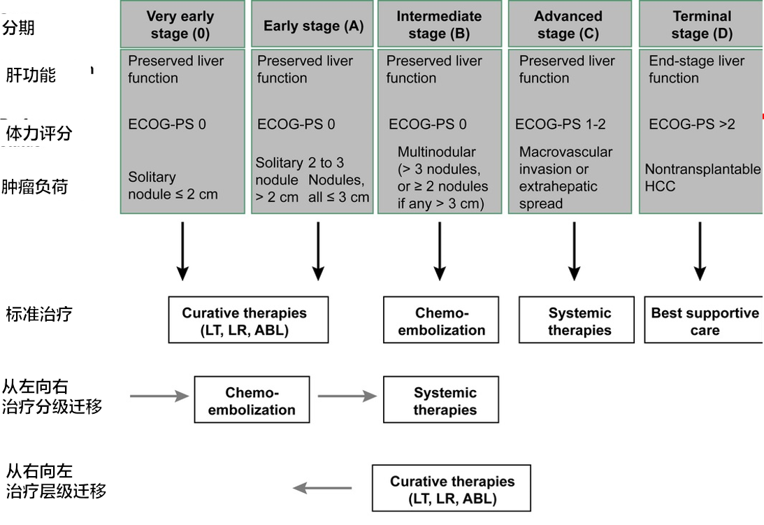 由于从左至右(即从根治性治疗到姑息性治疗)肝细胞癌(HCC)治疗方案的假定疗效逐渐降低,因此在不同阶段之间认可双向治疗迁移,显然是承认 BCLC 方案所推荐的一线治疗对于某些患者而言可能属于“过度治疗”,而对于另一些患者则属于“治疗不足”。