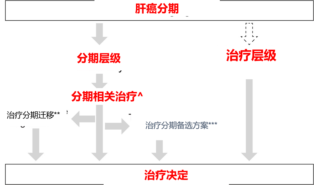 因此,“治疗阶段迁移”代表了一种调整,旨在缩小实际临床需求与僵化且有时不恰当的治疗决策之间的差距。然而,它仍保持了“分期决定”而非“患者定制”的肝癌管理理念,这种理念贯穿于 BCLC 系统的核心思想,即根据特定治疗可能取得最佳结果的最高概率对患者进行分组,而非为个体患者选择最佳治疗方案。这或许可以解释为何在该策略的定义中存在明显的倾向,即优先考虑从左向右的迁移。“治疗阶段迁移”因此可以被视为一种基于“分期层级”这一概念性构想的策略(下图 )。