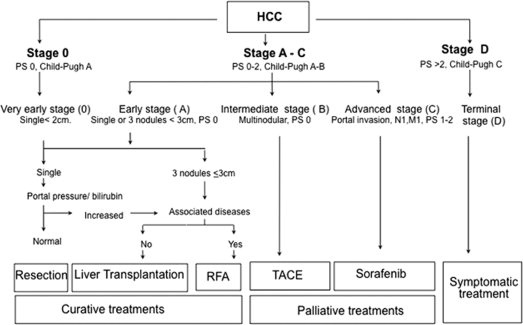| “治疗阶段迁移"(treatment stage migration or Treatment Stage Migration in Liver Cancer)这是一个非常重要且专业的肿瘤学概念。这一概念的正式定义最早由欧洲肝脏研究学会(EASL-欧洲癌症研究与治疗组织-European Organisation for Research and Treatment of Cancer)于 2012 年提出:: “在每个 (BCLC) 阶段中,有一部分选择患者并不完全符合治疗分配的所有标准。在这种情况下,建议为患者提供同一阶段内最合适的下一个治疗方案(如早期肝癌肝切除,肝移植和射频消融),或者提供下一个预后阶段的治疗方案(对于经动脉化疗栓塞失败或HCC进展更严重的患者)。”(下图)【Bruix J, 2011】(11)。两年后,巴塞罗那临床肝癌(BCLC)的作者也给出了类似的定义:“对患者的精细评估可能表明,在 BCLC 模型中作为首选考虑的治疗方案并不安全或不可行。因此,所选方案将对应于不同的发展阶段。这种现象被称为治疗阶段迁移。”【Reig M 2014】 BCLC分期系统(图2)[11]在临床实践中已被广泛接受,也用于许多治疗HCC的新药临床试验。因此,它已成为实际应用的分期系统。