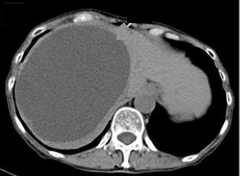 无症状大多数单纯性肝囊肿患者没有常见症状。 腹部包块或肝大 尽管并发症很少见,但不断增大的肝囊肿可能会引起症状。患有大肝囊肿的患者在体格检查时可能会摸到腹部肿块或肝肿大,以及腹部周长增大。 有症状5%的患者会出现临床症状,这是由于肿瘤逐渐增大或压迫了邻近组织所致【Salemis 2007】。有症状的肝囊肿在女性中更为常见(女性与男性比例为 9:1)【Bahirwani R 2008】。肝囊肿通常不会损害肝脏或其他器官的功能;然而,由于对胆道、血管和胃肠道的机械性压迫,会导致肝功能障碍或血液供应和肠道的通过障碍。虽然不具有特异性,但由肝囊肿生长和压迫引起的患者主诉包括腹部不适、疼痛、腹胀以及恶心、呕吐、饱胀感和早饱等饮食症状【Lantinga 2013 Mavilia 2018】。