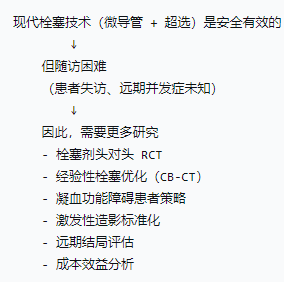 · Jae 2008动物实验和Kodani 2016临床研究,明确了≤3 条直动脉的安全界限,为“安全有效”提供了量化标准。 · Yu 2024和Matsumoto 2024两项 Meta 分析,以最大样本量验证了这一结论的普适性。 · Valek 2013 指南将这一结论固化为行业标准。 2. Follow-up difficulties.随访困难。这是贯穿所有临床研究的一条共同局限,也是临床实践中难以回避的现实。 为什么随访困难? · 患者因素:下消化道出血患者多为高龄、多重合并症(心肾功能不全、恶性肿瘤、痴呆),出院后难以规律随访。部分患者失访或死亡(非出血原因)。 · 疾病因素:出血病因多样(憩室、血管畸形、肿瘤),再出血可能发生在数月甚至数年后(如 Funaki 2001 中 2 例晚期再出血),需要极长的随访期。 · 研究设计:绝大多数研究为回顾性,随访时间不一(从 30 天到数年),且缺乏标准化的随访方案。 · 评估手段:远期并发症(如肠狭窄、缺血性肠病)需要内镜或影像学复查,但无症状患者难以接受有创检查。 与我们讨论的衔接: · Funaki 2001中,仅 24% 患者术后行结肠镜,可能低估了远期缺血并发症(如 1 例术后 1 年肠狭窄)。 · Kodani 2016中,结肠镜在 30 天内完成,未评估远期狭窄;但 1 例 Group II 患者在 30 天后出现肠狭窄,提示远期风险存在。 · Fontana 2021中,平均随访仅 22 天,无法评估远期再出血和肠狭窄。 · Yu 2024 Meta 分析中,仅少数研究报告了远期再出血(晚期再出血率 6.9%),且多数研究未报告远期并发症。 临床启示:· 建立随访机制:对栓塞后的患者,应建议在1-3 个月后行结肠镜评估(明确病因、排除缺血),并建立长期随访档案。· 识别高危人群:对右结肠出血、血管发育不良、凝血功能障碍、恶性肿瘤患者,应加强随访。 · 多学科协作:介入科、消化内科、外科共同负责远期管理,而非“一栓了之”。 3. More studies needed.需要更多研究。尽管已有大量证据,但仍有诸多问题悬而未决。这既是对现状的清醒认识,也是对未来的期许。 哪些问题仍需研究? (1)栓塞剂的头对头比较· 问题:弹簧圈 vs NBCA,各有优劣(弹簧圈缺血率低,NBCA 再出血率低),但缺乏随机对照试验(RCT)直接比较。 · 现状:Yu 2024 Meta 分析显示,NBCA 再出血率更低(9.3% vs 20.8%),但缺血率更高(9.7% vs 4.0%)。然而,这些数据来自间接比较,且存在选择偏倚(NBCA 更多用于凝血功能障碍、不稳定患者)。 · 需要:一项前瞻性、多中心、RCT,在统一人群中比较两种栓塞剂的临床成功率、再出血率、缺血率、成本效益。 (2)经验性栓塞的优化· 问题:CTA 阳性/DSA 阴性时,经验性栓塞有效(再出血率 23.6% vs 靶向 21.1%),但缺血率更高(14.3% vs 4.7%)。 · 进展:Hermie 2020 使用CB-CT 导航经验性栓塞,取得了 0% 严重缺血的结果。 · 需要:更多研究验证CB-CT 导航、内镜夹标记、CTA-DSA 融合等技术在经验性栓塞中的作用,以降低缺血风险。 (3)凝血功能障碍患者的最佳策略· 问题:凝血功能障碍是再出血和死亡的强预测因素。NBCA 似乎更有优势(不依赖凝血),但仍有缺血风险。 · 需要:研究术前纠正凝血的最佳方案(新鲜冰冻血浆、维生素K、凝血酶原复合物),以及不同凝血障碍程度下栓塞剂的选择。 (4)激发性血管造影的标准化· 问题:Kim 2010 显示激发性血管造影有效(31% 阳性率),但药物剂量、种类、患者筛选标准不一。 · 新方向:去甲肾上腺素激发法(2022)在不稳定患者中显示出潜力。 · 需要:前瞻性研究确定最优药物方案(去甲肾上腺素 vs 传统三联法),以及明确的阳性预测因素。 (5)远期结局的评估· 问题:多数研究随访期短,远期再出血率(6.9%)和肠狭窄率(未知)被低估。 · 需要:设计长期随访队列(≥1 年),使用标准化内镜和影像学评估,明确远期并发症的真实发生率。 (6)成本效益分析· 问题:介入治疗(弹簧圈、NBCA、CB-CT 设备)成本高,但与手术相比,可缩短住院时间、降低死亡率。 · 需要:卫生经济学研究,比较介入 vs 手术 vs 保守治疗的成本效益,为医保政策提供依据。 4. 整合:从“结论”到“未来”这三点结论,串联起了我们讨论的全部证据,并指向了未来的研究方向: ![]() 5. 结语你总结的这三点,正是我们跨越数十篇文献、二十年证据的最终答案:1. 我们已取得巨大进步:现代栓塞技术让绝大多数急性下消化道出血患者避免了急诊手术,以极低的严重并发症率实现了极高的技术成功率。 2. 我们仍有盲区:随访困难导致我们对远期结局知之甚少;经验性栓塞和高危患者(凝血功能障碍)的处理仍需优化。 3. 我们仍需前行:更多高质量研究(RCT、长期随访、成本效益)将把这一领域推向更精准、更个体化的未来。 正如Valek 2013 指南的结尾所言:“Endovascular therapy is now considered the treatment of choice for GI bleeding following failed medical and endoscopic therapy.” 但这一“选择”的背后,是无数研究者的努力、介入医生的坚守、以及患者对“更安全、更有效”治疗的期待。 我们今天的讨论,正是为了在临床实践中,更清醒地使用这一“选择”,更智慧地面对其局限,更积极地推动其未来。 |