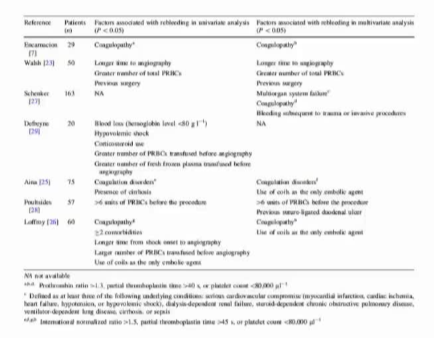 这张表格汇总了多项研究中经导管动脉栓塞(TAE)术后30天内再出血的预测因素,是介入放射学中评估预后、优化患者选择的重要参考依据。