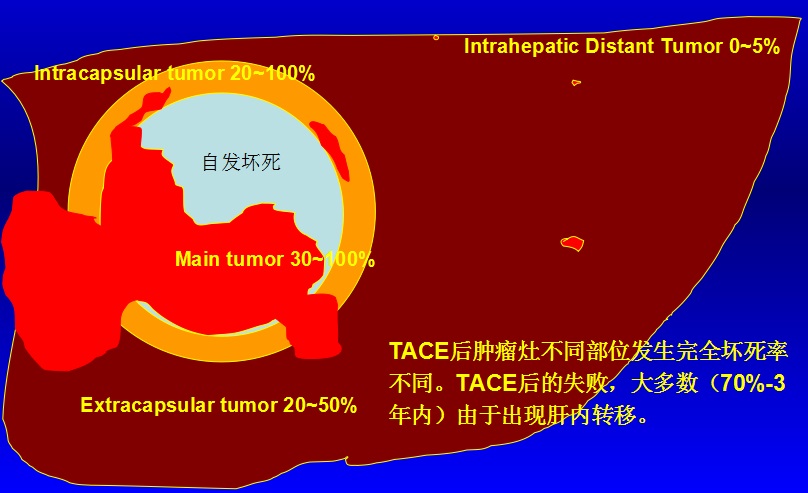 肝脏的血液供应有肝动脉和门静脉两者来源。因此,如果只有肝动脉被栓塞,肝组织不会坏死。但是,肝细胞肝癌主要靠肝动脉供血(占95%),因此,动脉栓塞只引起肝癌缺血而导致坏死。但是,非肿瘤的肝实质组织在不同程度上受到注入肝动脉的栓塞物质的影响。