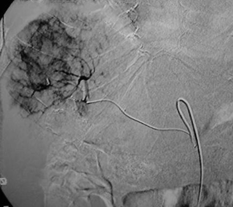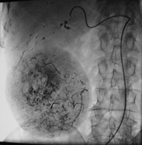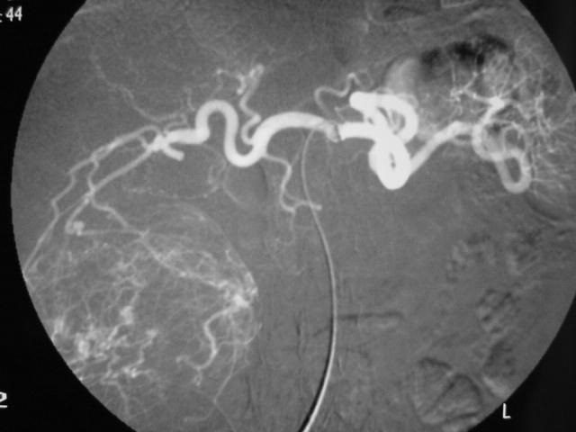 当肿瘤比较局限,导管可以前进至段或者亚段动脉,从而只对存在肿瘤区域进行化学栓塞。使用这项技术时推荐使用共轴的微导管。整体肿瘤区域是否完全被导管栓塞可以从动脉造影中估计,但是,从导管内注入造影剂时进行动脉造影CT可以得到更准确的评价。