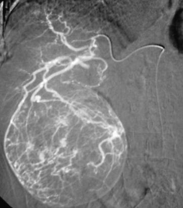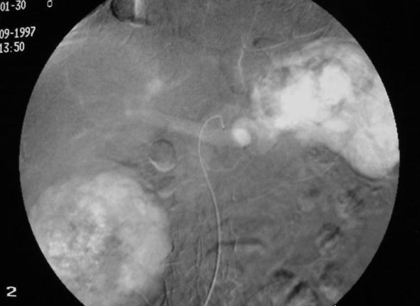 判断肿瘤供血主要决定需要栓塞的肿瘤血管。如果肿瘤的范围较大,则应从肝固有动脉或者右肝、左肝动脉进行化疗性栓塞。如果将导管置于肝固有动脉有一定的困难,或可先进行胃十二指肠动脉栓塞(通常为弹簧栓子)以改变血流方向,从而可以从肝总动脉处释放栓塞剂。这项技术也用于左肝动脉从胃左动脉发出处。当导管不能被放入发自胃左动脉的副左肝动脉远端时,这项技术也是有效的。如果肝固有动脉严重的狭窄或者闭赛,则可以使用球囊导管经门静脉周围的动脉侧支阻塞肝总动脉从而达到肿瘤的化学栓塞作用。
