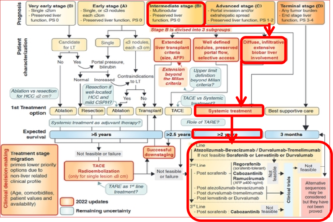 中期肝癌(B期)肝移植米兰标准或扩大米兰标准→ 肝移植 → 不可行或失败 → TACE或TARE → 不可行或失败 → 全是一线治疗→ 全身二线治疗 →全身后线临床试验。![]() 中期肝癌 (B期)边界清楚的结节,门脉血流好,选择性进入路径1:→ TACE>2.5年 → 成功降期治疗 → 肝移植 →如果不行或失败→ TACE 或TARE → 路径2:→ 全身治疗 → >2年 → 全身一线治疗→ 全身二线治疗 → 后线临床试验 ![]() 肝癌中期(B期)弥漫性,侵润性,广泛性双叶受累→ 全身治疗 → 一线治疗→ 二线治疗>2年![]() |