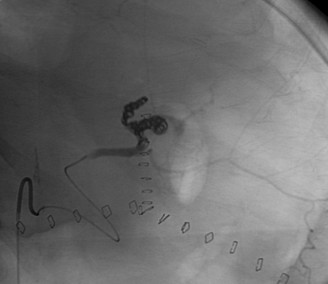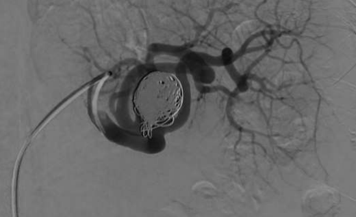 巨大脾动脉瘤是罕见的,并且由于其巨大的体积而难以栓塞。适用前后门栓塞的原则,但在如此大的动脉瘤中,后门插管是困难的。良好的支撑导管是关键。巨大的动脉瘤囊本身也被证明很难完全栓塞。可能需要不同栓塞剂的组合——在这种情况下是弹簧栓子/NBCA/凝血酶。以确保足够的流量进入这些巨大的动脉瘤。