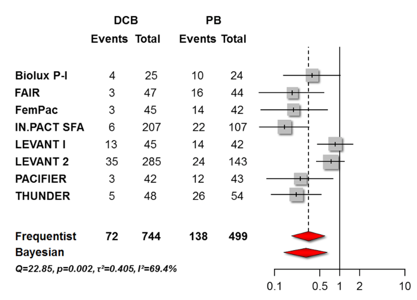 森林图显示了主要分析的结果:在12个月的靶病变血运重建中,与PB相比,DCB使RR降低了67%。贝叶斯估计(综合效应较低,RR: 0.30; 95%可信区间:0.14 ~ 0.58)具有一致性。CI =可信区间;DCB =药物涂层球囊;PB =普通球囊;RR =风险比。贝叶斯估计的可信区间。