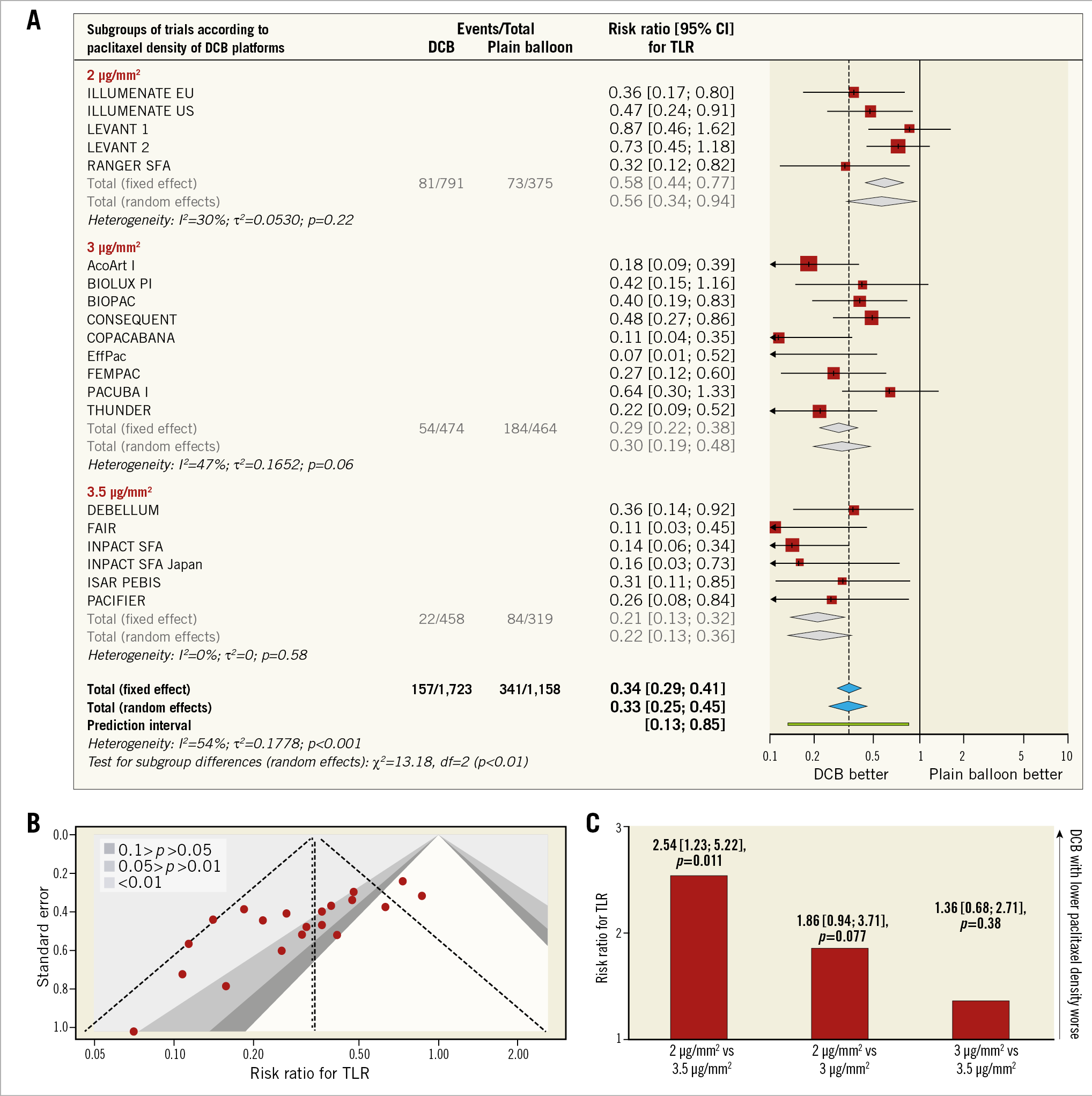 :尽管考虑了亚组试验之间的依赖性,结果保持不变。存在高异质性(I² = 54%,p < 0.01),但与发表偏倚无关。间接比较显示,紫杉醇密度为2 μg/mm²的DCB平台的TLR风险显著高于紫杉醇密度为3.5 μg/mm²的平台(2.54 [1.23; 5.22],p = 0.011),而与紫杉醇密度为3 μg/mm²的平台相比,TLR风险趋势更高(1.86 [0.94; 3.71],p = 0.077)。